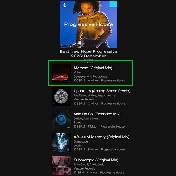 Voilan‘s latest track #Moment entered on December Best New Progressive House #HypePicks Compilation #beatport ♥️